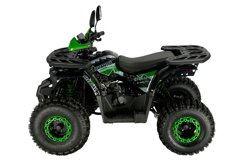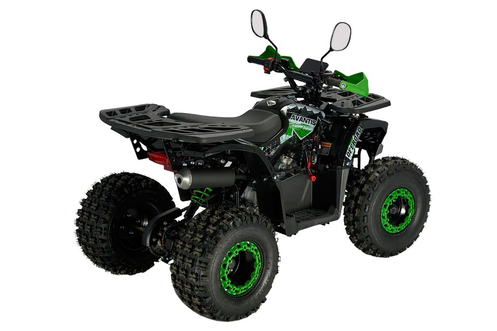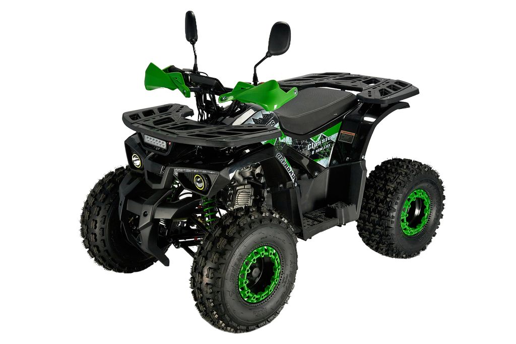 ATV Classic 8 Lux NEW (A) — компактный подростковый квадроцикл с 125 см³ бензиновым двигателем (~9,5 л. с.), автоматической трансмиссией с реверсом и электростартером. Комплектуется регулируемой подвеской, багажниками, светом, защитой рук и системой родительского контроля. Идеален для детей от 6–8 лет.