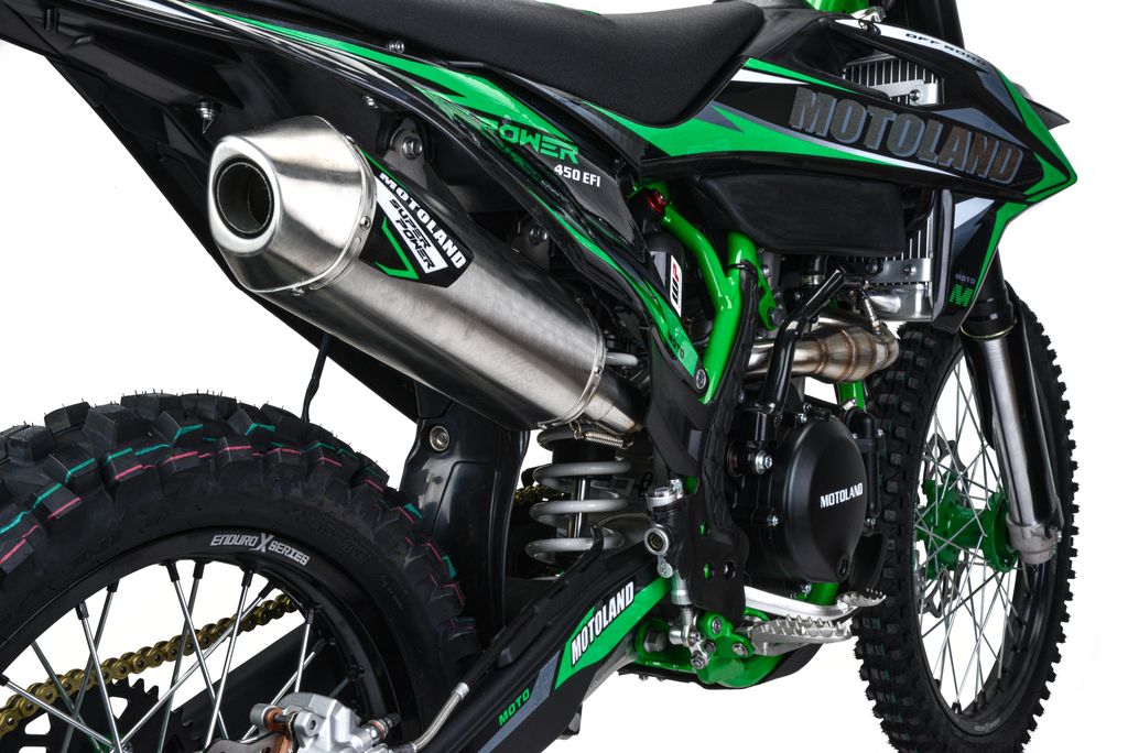 Мотоцикл MotoLand 450 FX450 EFI предназначен для езды по бездорожью и соревнований по мотокроссу. Имеет хорошую проходимость, прекрасно ведёт себя на песке, грунте и подходит для асфальтовых дорог.